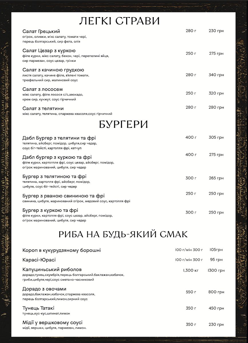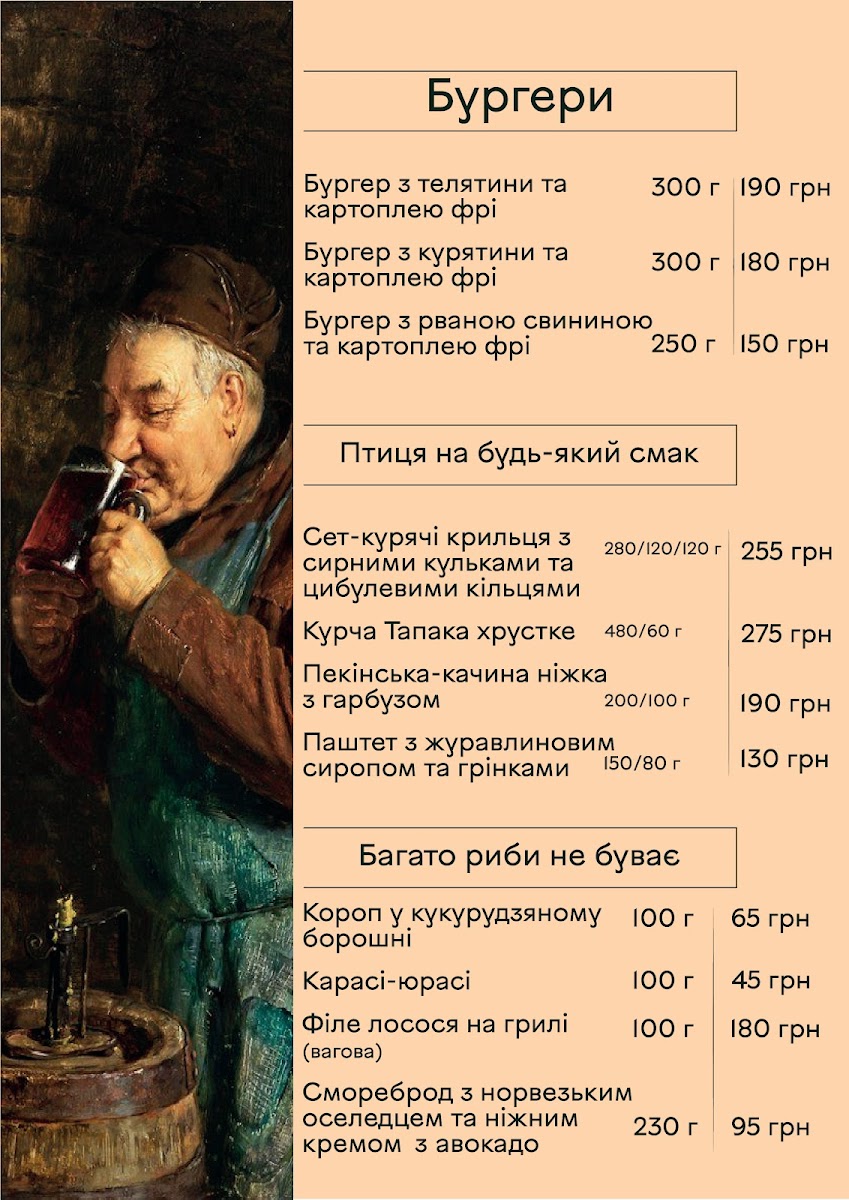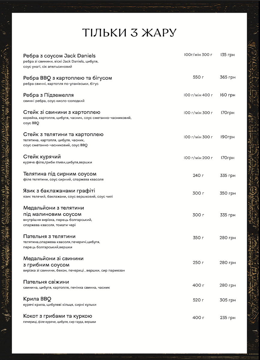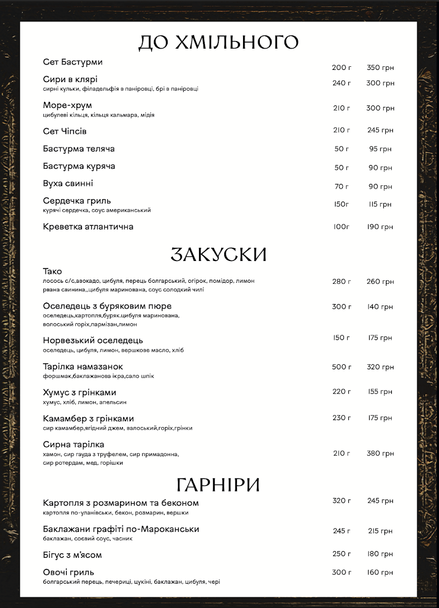 From a reviewer’s perspective, the menu section “До хмільного” offers a concise but appealing selection designed to pair well with drinks, featuring flavorful, savory options. The Сет бастурми stands out as a classic choice, offering a rich assortment of cured meats that complement beer or stronger beverages perfectly, while the Ребра з соусом Jack Daniel's provide a heartier option, combining tender ribs with a distinctive whiskey-infused sauce that adds a sweet and smoky depth of flavor. Even though the selection is limited, these dishes feel carefully chosen to match the theme of enjoying food alongside drinks, making this part of the menu simple but satisfying for those looking for bold, meat-focused flavors.