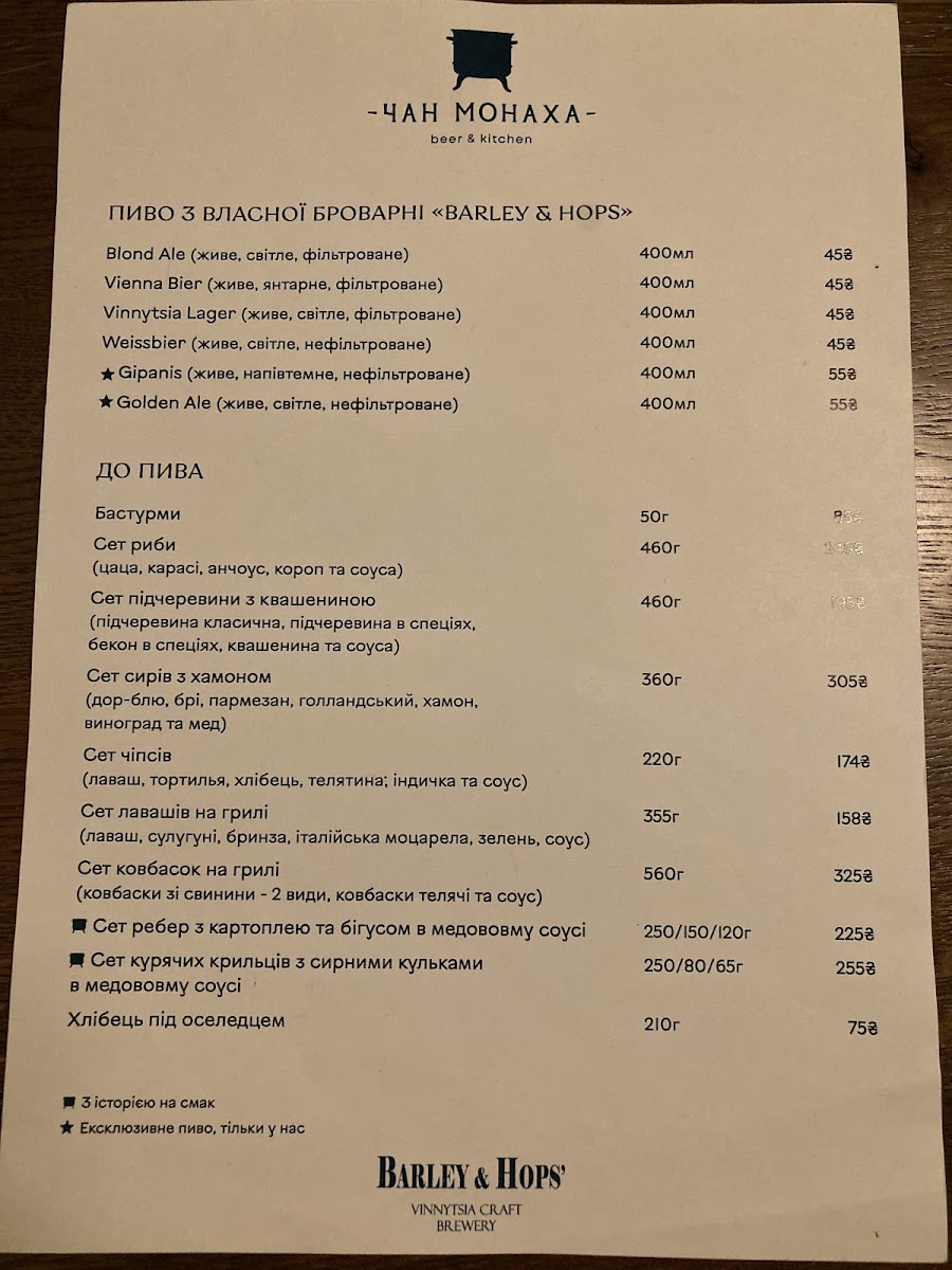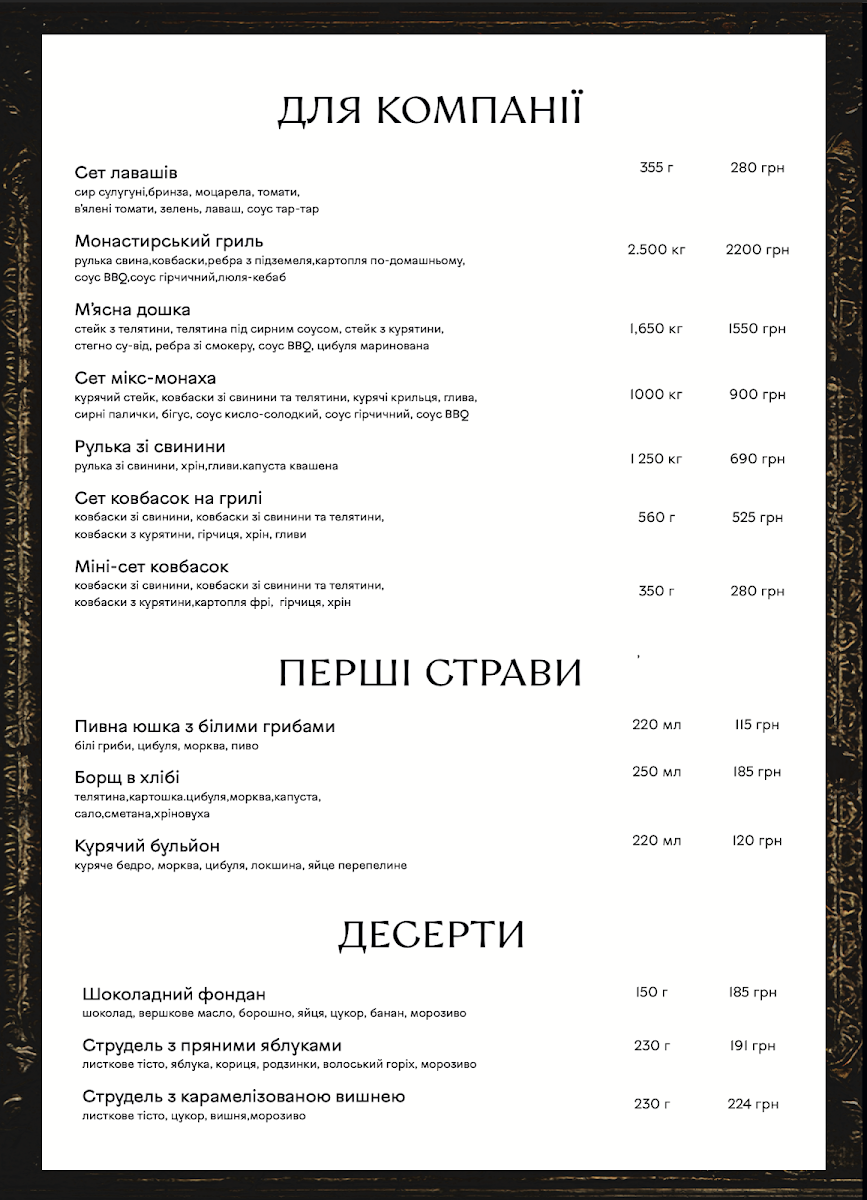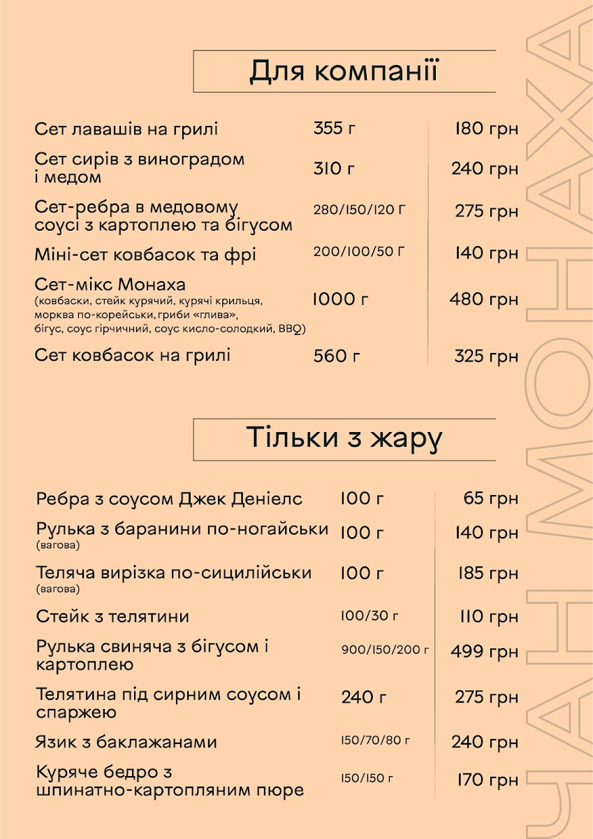 From a reviewer’s perspective, the menu section “До хмільного” offers a concise but appealing selection designed to pair well with drinks, featuring flavorful, savory options. The Сет бастурми stands out as a classic choice, offering a rich assortment of cured meats that complement beer or stronger beverages perfectly, while the Ребра з соусом Jack Daniel's provide a heartier option, combining tender ribs with a distinctive whiskey-infused sauce that adds a sweet and smoky depth of flavor. Even though the selection is limited, these dishes feel carefully chosen to match the theme of enjoying food alongside drinks, making this part of the menu simple but satisfying for those looking for bold, meat-focused flavors.